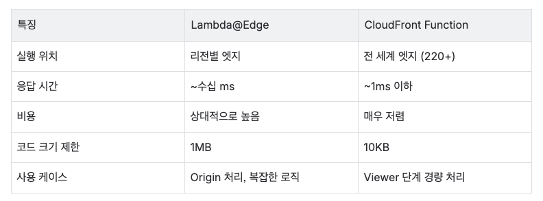 Viewer Request에서 분기하여 Viewer Response로 응답하는 우리 케이스에는, CloudFront Function이 기능적으로 충분하면서도 성능과 비용 면에서 훨씬 유리했습니다.