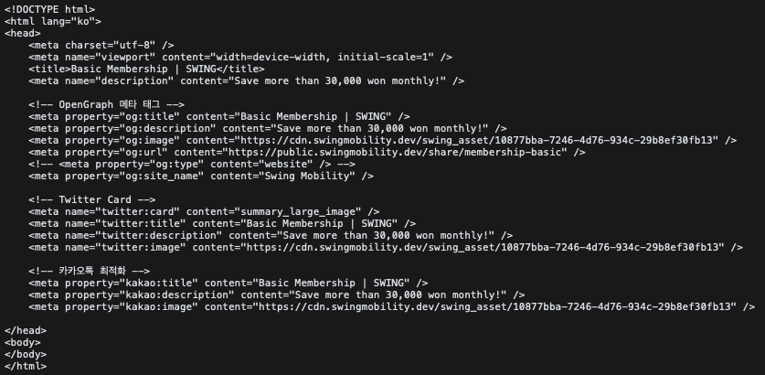 진짜 필요한 것은 소셜 크롤러에게만 멤버십별 메타를 제공하는 것이었습니다. 실제 사용자에게는 기본 메타 태그(스윙 서비스 범용 정보)로도 충분했죠.