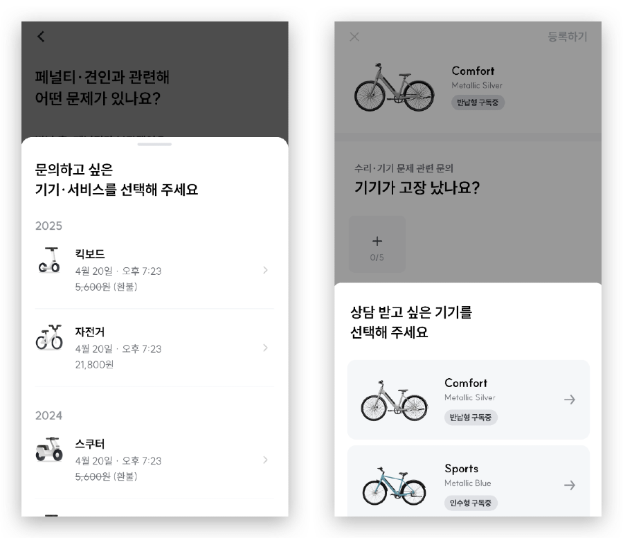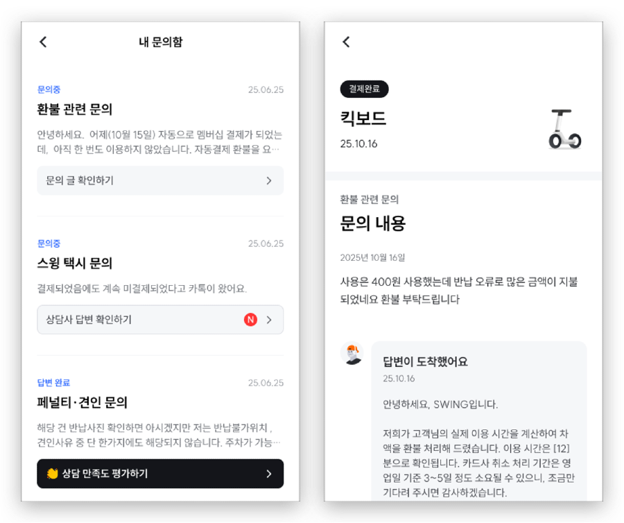 - 고객은 앱에서 라이드/구독 이력 선택 → 문의 생성으로 흐름을 단순화했습니다.