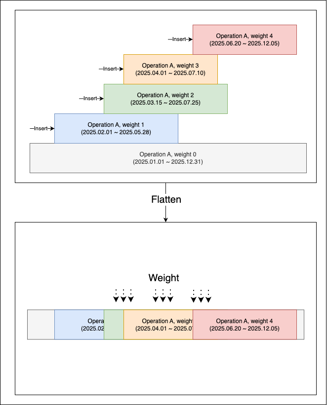 각 시간 구간마다 가장 가중치(weight)가 높은 레코드만이 위로 드러나고, 나머지는 가려지게 됩니다. 결과적으로 사용자는 복잡한 이력 속에서도 항상 "현재 유효한 최신 운행일정" 만을 바라보게 됩니다.