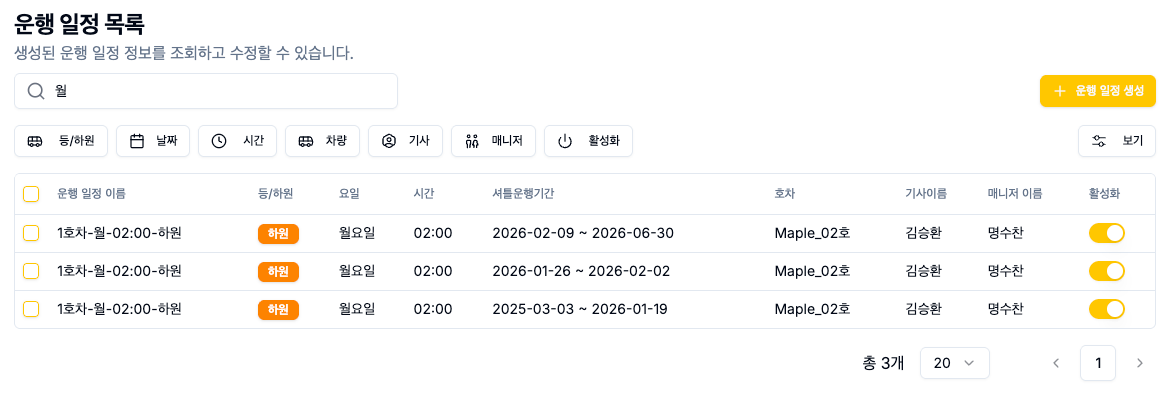 운행일정은 특정 기간 동안 반복적으로 운행되는 노선, 기사, 동승매니저 정보 등을 포함하는 데이터입니다.